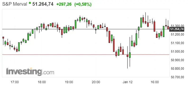 En estos momentos en el gráfico de abajo de las últimas 24 horas podemos ver unas cotizaciones que se encuentran en verde, caracterizando el índice argentino por subidas del 0.58%, que se traducen en unos 297.26 puntos, llevándo a unas cotizaciones del momento actual de unos 51264.74 puntos, que no se salen en ningún momento de la media que crean el nivel de soporte y el nivel de resistencia, aunque se trate de un nivel más próximo al de resistencia. El nivel de soporte lo vemos en unos 50810.61 puntos, mientras que el nivel de resistencia lo encontramos en unos 51458.91 puntos.