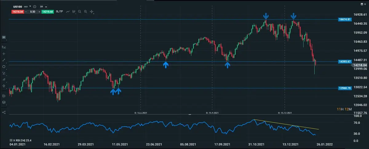 Gráfico actualizado del Nasdaq en una temporalidad diaria, se espera que el día de hoy las caídas se moderen a la espera de lo que pueda suceder el día de mañana.