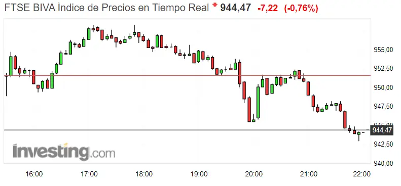 El índice FTSE Biva se mantiene en su estrecha media móvil que enuentra los niveles S y R muy próximos a las cotizaciones del momento actual. El que consideramos nivel de resistencia es el de 958.29 puntos, frente al nivel de soporte de 943.07 puntos. En el momento actual las cotizaciones del FTSE Biva se hallan en rojo, con bajadas del 0.76%, lo que se traduce en un descenso de 7.22 puntos, dejando el índice mexicano en 944.47 puntos. Lo que le afecta hoy a la bolsa mexicana, aparte de las cotizaciones del índice FTSE BIVA serán los datos de la inversión fija bruta, que conoceremos a las 13:00 de la tarde de hoy.