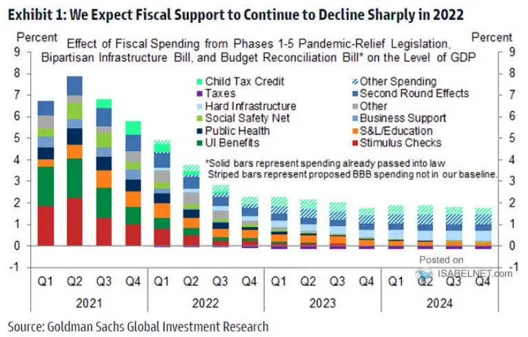 Las subidas de tipos suelen trasladar inseguridad a los inversores, máxime cuando las valoraciones del mercado son tan exhuberantes como las actuales que es cuando aumenta notablemente la vulnerabilidad. Por otra parte, además de subidas de tipos, los estímulos monetarios en EE.UU., decaerán durante este primer trimestre pero durante el año 2022 también cederán los fiscales.