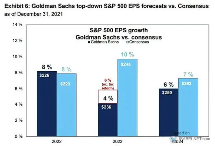 Gráfico que muestra las previsiones de crecimiento del SP500 para este año y la relación entre el consenso de Goldman Sachs