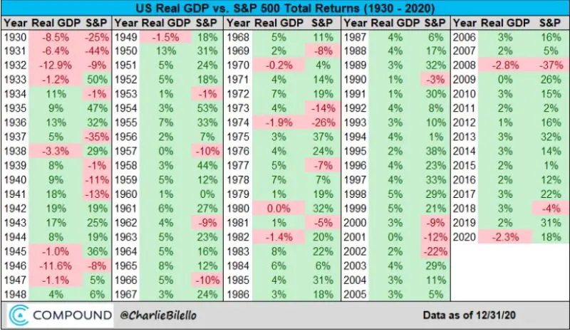 Gráfico que muestra las diferencias entre lo que hace el SP500 y el PIB de Estados Unidos en los últimos años