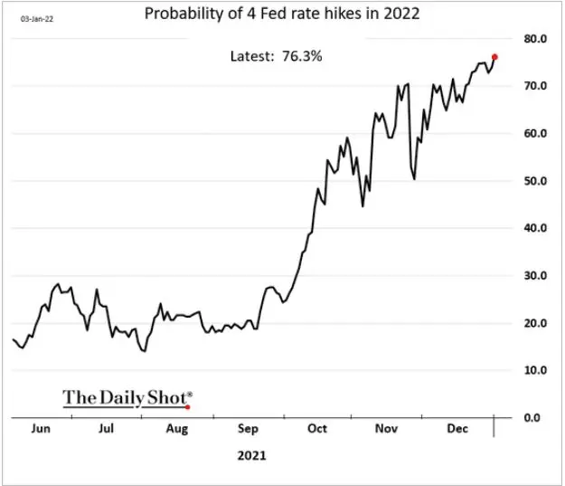 Desde hace meses vienen discrepando de las proyecciones de inflación de la FED y de la previsión de la subida de tipos, desde verano venían anticipando subidas para este año (al menos dos, una en junio y otra en noviembre cuando la FED todavía afirmaba que al menos hasta 2023 no movería ficha) y actuando en consecuencia para proteger su cartera. Ahora la FED ha reconocido que la inflación es un problema y no transitorio, que ha anticipado en su hoja de ruta las fechas para iniciar las alzas de tipos de interés este 2022, los expertos van más allá y descuentan que se producirán hasta 4 subidas este año con un 76.3% de probabilidad.
