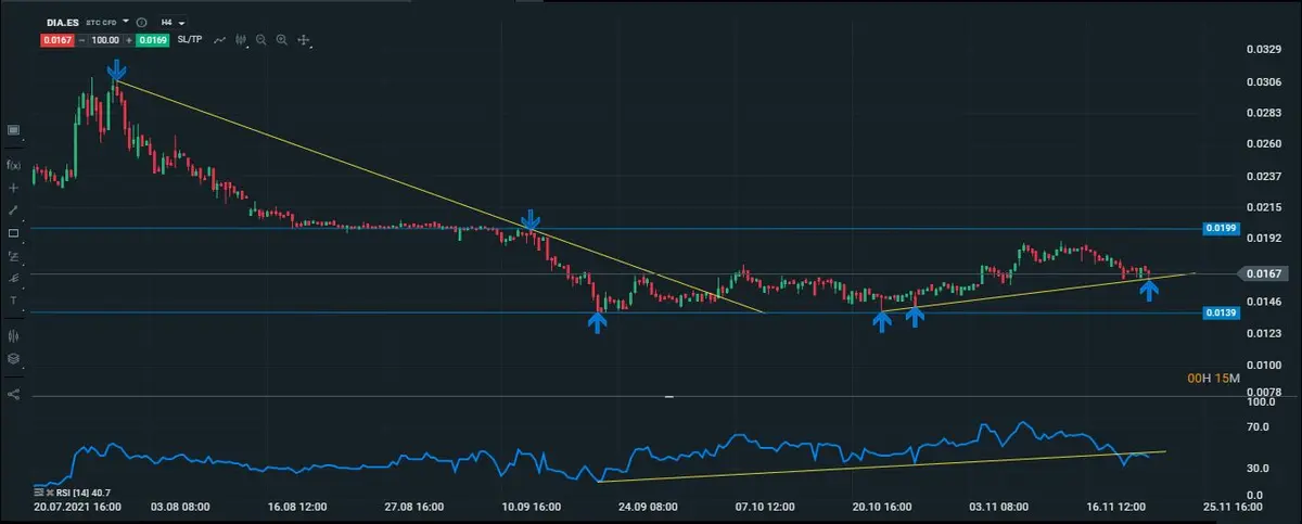 Si quisiéramos ser optimistas con los movimientos de la acción, entonces tendríamos que ver roturas por la parte de arriba del rango lateral en el que se encuentra la acción, que como ya hemos comentado, se encuentran sobre los 0.019 puntos. En el plano negativo diremos que para posicionarnos bajistas, solo nos tiene que bastar que el precio de la acción rompa los suelos que se encuentran en los 0.013 puntos, siendo esta manera la única posible que nos serviría para poder posicionarnos tanto alcista, como también bajista, sobra decir que ambos movimientos tienen que ir acompañados de roturas al alza o a la baja por parte del indicador del RSI, que de momento como se puede observar, el RSI, está realizando un pequeño movimiento a la baja, todavía no está del todo claro, así que esperaríamos a que se confirmen las rupturas a la baja.