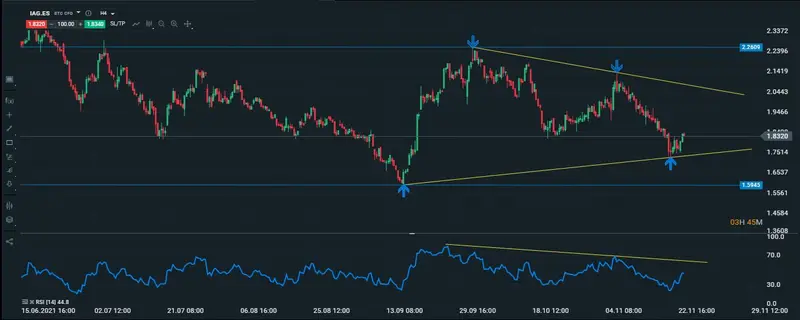 Si la anterior semana comentábamos de que se podrían dar más correcciones en los movimientos de la acción de esta compañía, el día de hoy parece que los movimientos de la acción nos indica otra cosa, ya que de momento es la acción que mejor desempeño viene teniendo dentro del índice español, con subidas que rondan el 3.84%. Si miramos su gráfico intradiario veremos que el precio de la acción se detuvo sobre los 1.72 puntos, a milésimas de los suelos que se encuentran en los 1.59 puntos, lo que claramente nos permite trazar una línea que una sus mínimos crecientes, que al igual que sus máximos vienen siendo decrecientes, lo que nos daría a entender de que se podría estar formando una especie de triángulo. De momento se puede apreciar que tanto los mínimos como los máximos, ambos tienen dos testeos por lado, lo que significaría de que el precio de la acción es posible que vaya en busca de testear la línea que une sus máximos decrecientes.