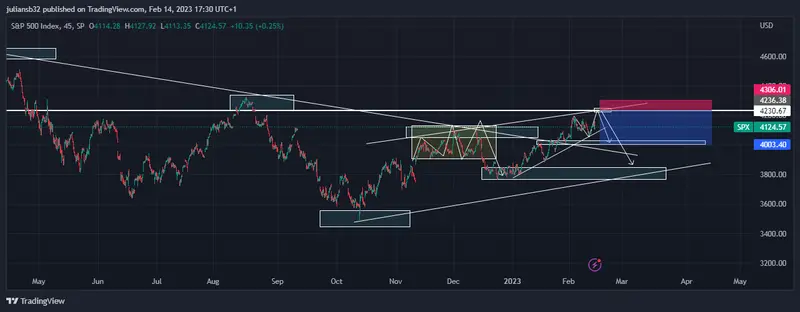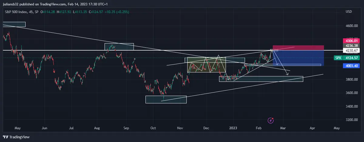 En los meses anteriores, el índice Standard & Poor's 500 ha mostrado una gran recuperación desde los mínimos del mes de octubre, lo cual ya representa casi un 20% de ganancias respecto a los mínimos. La estructura bajista del índice Standard & Poor's 500 se rompe en las últimas semanas del mes de enero, y con los datos de inflación publicados el día de hoy, se abre la posibilidad de correcciones y visitar la zona de rompimiento de la estructura bajista, la cual puede actuar de soporte.