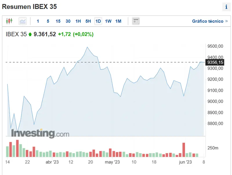 En estos momentos el IBEX 35 esta viviendo un alza del 1,72% lo que le permite superar con cierta holgura los 9300 puntos y situarse con 9361,52.