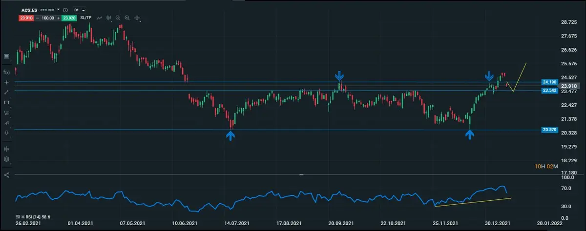 La compañía del presidente del Real Madrid, le quita el puesto a Siemens Gamesa y de momento es el activo que más corrige dentro del parqué bursátil español.superando con holgura el 3% de caída, en su gráfico diario vemos un movimiento que se podría considerar como un BULLTRAP, que consiste en que el precio de la acción rompe unos techos importantes, para engañar a los inversores novatos y hacerles creer de que se espera un gran movimiento alcista, pero al poco tiempo después el precio de la acción comienza a girarse a la baja y los inversores novatos caen en la trampa del inversor inteligente. Son pocas las veces que este tipo de movimiento se suele dar, pero cuándo pasa, las caídas no son nada pequeñas, tal como se puede observar en el gráfico el precio llegó a los 24.90 puntos, para luego girarse a la baja y actualmente lleva un movimiento correctivo que ya supera el 3% de corrección, un poco más de 113 pips de caída.