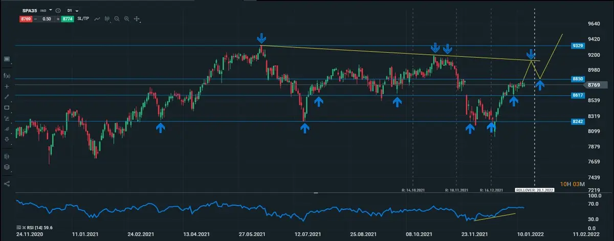 Dada la situación actual y con la posibilidad de ver una primera subida de tipos en el mes de marzo, las posibilidades de ver a un Ibex35 marcar nuevos máximos se podrían ver reducidas, ya que sus últimos máximos se encuentran en los 9329 puntos, y si actualmente el precio se encuentra cotizando en los 8770 puntos, podríamos esperar una subida del 6 %, antes de que se den unas correciones duras por parte del mercado ante la nueva política dura de la Reserva Federal, por tanto habrá que estar atentos en las próximas sesiones, si lo que buscamos es un posicionamiento alcista en el índice.