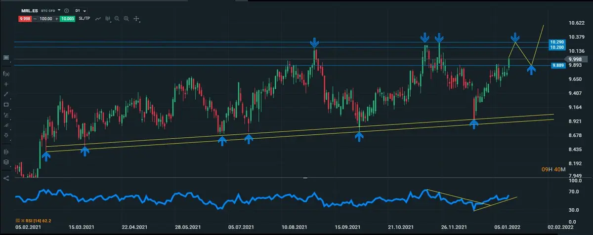 La compañía inmobiliaria Merlin properties, cierra la semana con un movimiento alcista que de momento supera el 2%, en su gráfico diario vemos la tendencia principal es alcista y el precio de la acción se ve claramente que busca llegar hasta los techos dónde están sus máximos históricos.