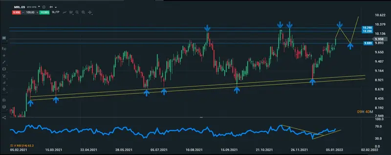 ¿Qué esperamos que suceda en las próximas sesiones? Dado el movimiento netamente alcista que tiene el precio de la acción, consideramos que una vez que el precio llegue a los techos que se encuentran en los 10.29 puntos, sufra una corrección hasta los techos que se encuentran en los 9.88 puntos, para luego volver a intentar una vez más superar los techos en dónde se encuentran sus máximos históricos.