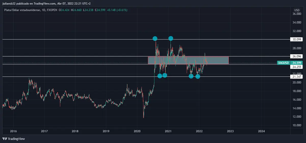 Desde el punto de vista estructural la plata se encuentra en una zona de consolidación desde hace un buen tiempo y en donde los compradores están aprovechando la zona de soporte de los 21 usd a 22 usd en donde en los últimos dos años la ha visitado en 4 ocasiones y no ha podido romper esa zona, también esperan para vender en la zona de los 30 usd la cual ha actuado muy bien de zona de resistencia y en los últimos dos años la ha visitado en dos ocasiones ,ahorita el precio está en una zona de equilibrio como se observa en el siguiente gráfico: