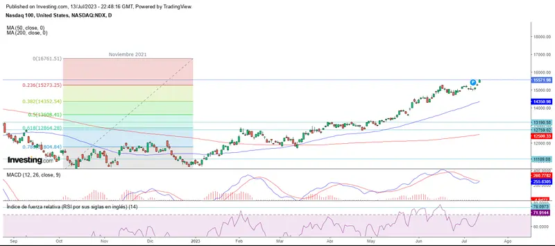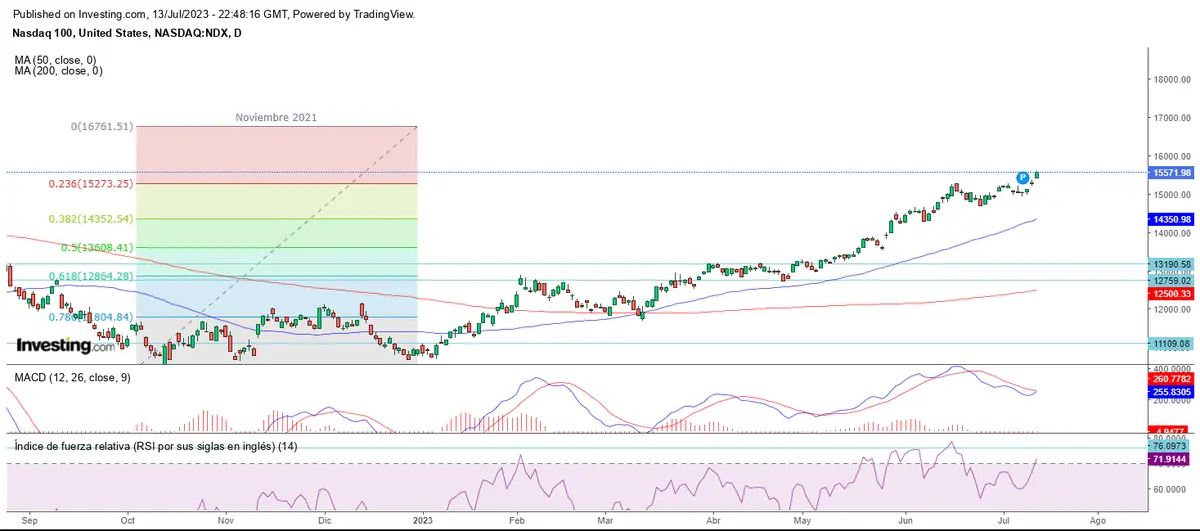 El Nasdaq recibe un gran impulso alcista esta semana, superando el 23.60% de Fibonacci y cerrando la sesión del jueves en los 15.571 puntos.