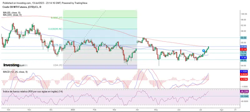 Finalmente el crudo WTI despega con fuerza, supera la resistencia mencionada y cotiza en la última sesión de la semana en los 77.22 dólares.