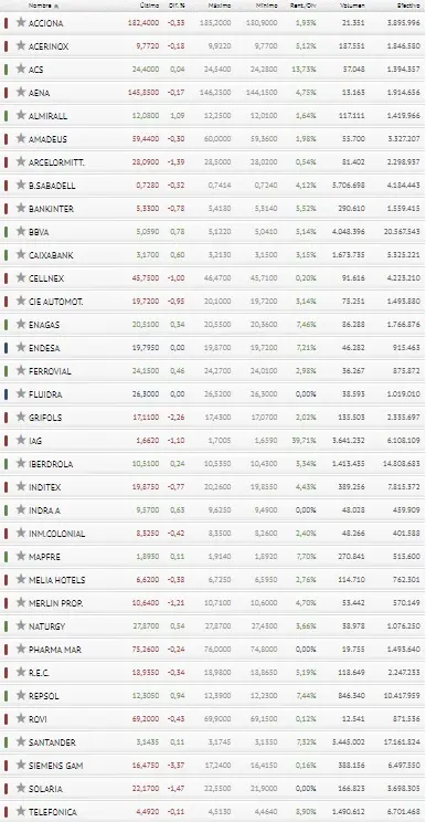 Tomando como referencia esta misma imagen, observamos a 12 acciones que resaltarán en Ibex 35 y estás empresas sirven de protección para no seguir cayendo en gráficas. Mientras que en el caso contrario hay 21 acciones que estarían flojas y que tienen un gran volumen en cifras relativamente bajas.