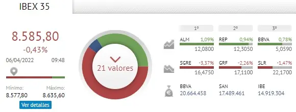 El índice de Ibex 35, a la hora actual de las 10:00 am, está con un monto total de 8 585,80 EUR.