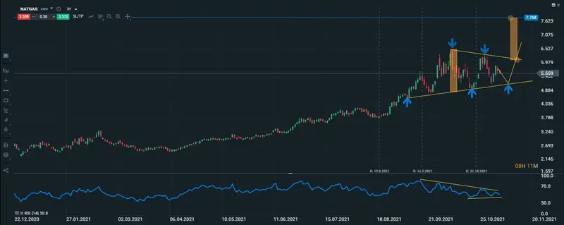 Pero si nos ponemos a mirar los gráficos de alguna de las materias primas,veremos que alguna de ellas todavía no han roto suelos importantes y por ello estaría bien estar atentos, por si sus próximos movimientos son alcistas o si por el contrario de continuación bajista, por ejemplo: Gas natural en su gráfico diario todavía nos muestra que tiene intactos sus mínimos crecientes, y aunque sus máximos son decrecientes podemos ver que se podría estar formando una especie de cuña ascendente, que de romper el precio por la parte de arriba podríamos estar ante fuertes revalorizaciones en el precio de esta materia prima. Por otro lado si miramos el indicador del RSI veremos claramente una tendencia bajista, que se agravaría aun más si la línea que une sus mínimos crecientes son superadas por la línea del RSI, llegados a este momento y si vemos que en el gráfico el precio rompe la línea de tendencia de mínimos crecientes, entonces eliminaríamos por completo cualquier movimiento alcista en el caso de esta materia prima.