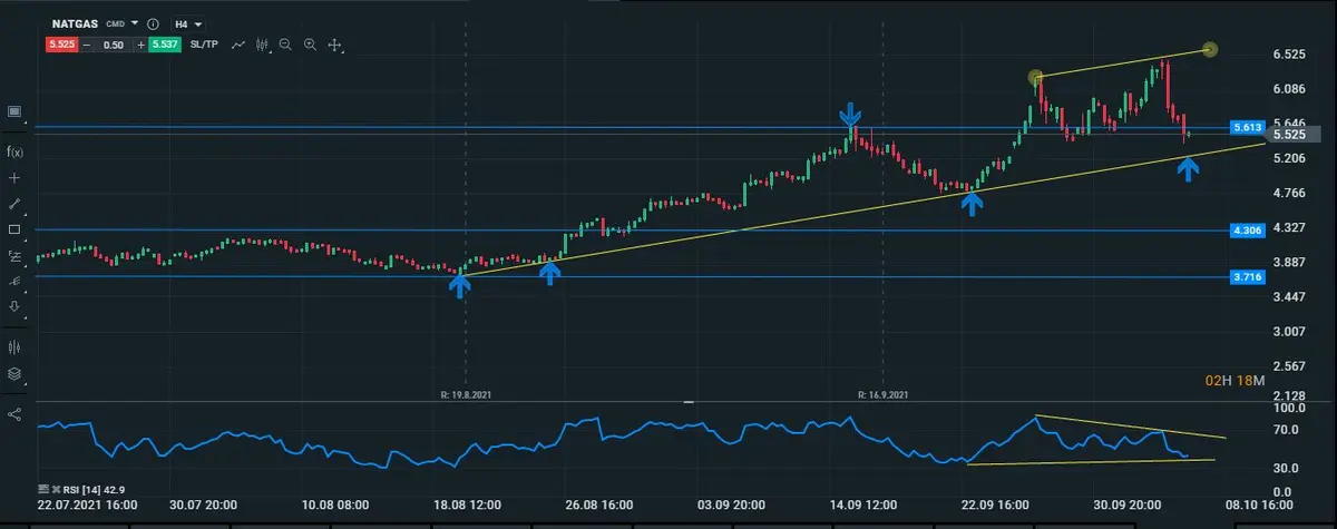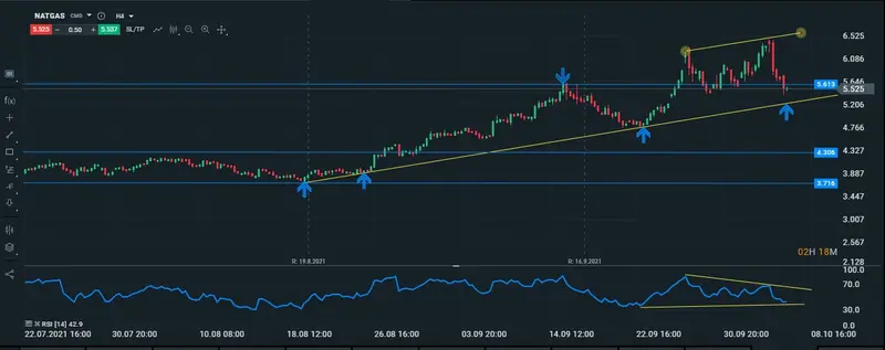 Justo cuándo se esperaban correcciones fuertes el día de ayer en todos los parqué bursátiles, el presidente de Rusia el señor Vladimir Putín, emitió un comunicado diciendo que se comprometía a enviar más gas hacia Europa provocando una rápida caída en el precio de esta matería prima, dicha corrección fue de un 16% , y si miramos su gráfico intradiario del gas, veremos que el precio del gas ha llegado a detenerse en unos techos que se encuentran sobre los 5.61 puntos, y que al parecer le han funcionado muy bíen porque como se puede apreciar, el precio del gas parece que ha vuelto a retomar su senda alcista. Si quisiéramos saber si todavía podemos esperar más correcciones en el precio del gas, podríamos utilizar un indicador como el RSI, para más o menos ver señales de que el movimiento bajista todavía no ha acabado o si por el contrario ya se acabaron las correcciones en el precio del gas, y como se puede apreciar en el indicador mientras el RSI marcaba máximos decrecientes, el gráfico marcaba máximos crecientes, esta es una clara señal de posibles cambios de tendencia, pero también el RSI nos marca unos mínimos crecientes, lo que nos llevaría a pensar de que todavía se podrían estar dando más correcciones en el precio del gas.