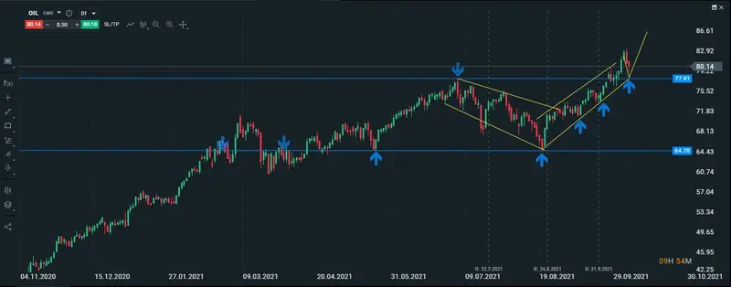 Las palabras del presidente de Rusia no sólo provocaron caídas en los precios del gas, sino también en los del petróleo, como se puede ver en su gráfico diario, el precio del petróleo tras haber sufrido una corrección del 15% entre julio y agosto de este año, llega a detenerse en una zona pivote que se encuentra en los 64 puntos, el precio del pretóleo comienza a recuperar terreno logrando formar un perfecto canal alcista llegando incluso a superar sus antiguos máximos que se encontraban en los 77 puntos, para poder marcar unos nuevos máximos sobre los 83 puntos, a tan solo un pequeño porcentaje de llegar a su siguiente techo importante que se encuentra en los 86 puntos.