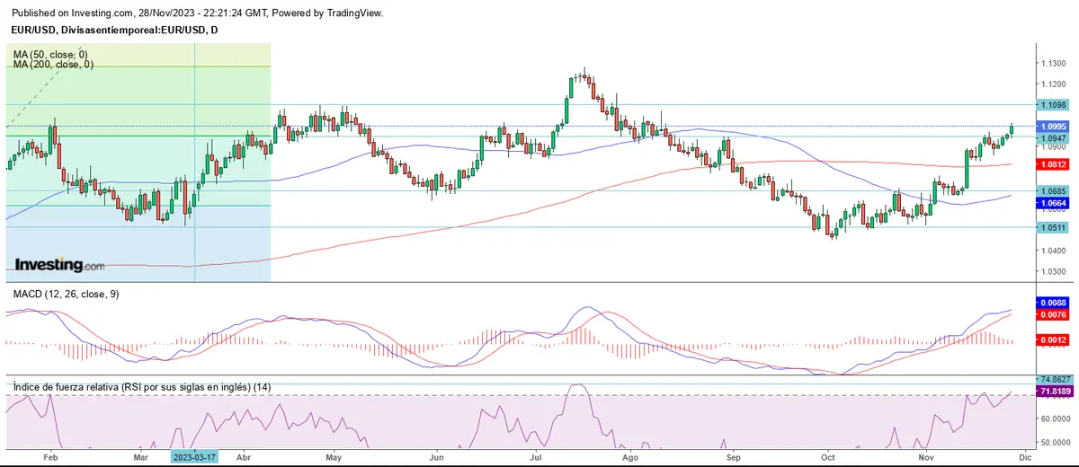 El EUR/USD mantiene su impulso alcista de la semana pasada y alcanza los 1.0995, superando la resistencia marcada anteriormente.