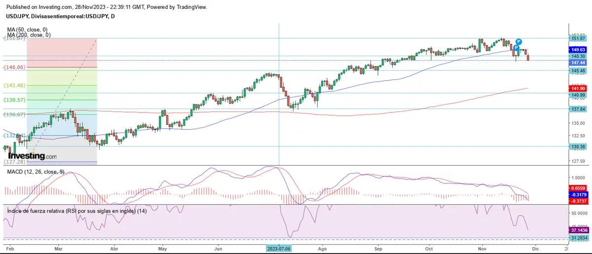 Tras dos alcances del máximo anual en el USD/JPY, el par no pudo volver y la última corrección arrastra a su precio hasta por debajo del último soporte en los 147.43.