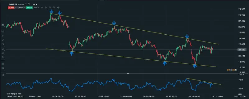 La compañía Siemens Gamesa, se ha ganado el trofeo a la peor acción del día, si miramos su gráfico intradiario ,veremos que tras haber testeado el precio la línea que une sus mínimos decrecientes, el precio toma impulso con la posibidad de que llegue a la parte superior de la línea que une sus máximos decrecientes ¿Esperamos más correcciones? Basta con ver el gráfico de la acción para responder a esta pregunta, ya que como se puede observar el precio viene formando un perfecto canal bajista, lo que nos llevaría a pensar de que todavía hay claras posibilidades de que el precio continue corrigiendo. En el caso de que busquemos movimientos alcistas, lo que tendríamos que ver es si el precio logra romper los techos que se encuentran sobre los 23 puntos, hasta que no veamos roturas de esos techos, y también subidas en los movimientos del RSI, la posibilidad de que la compañía continue perdiendo poder adquisitivo es grande, todo dependerá de los siguientes movimientos que se vengan dando en el gráfico de la compañía.