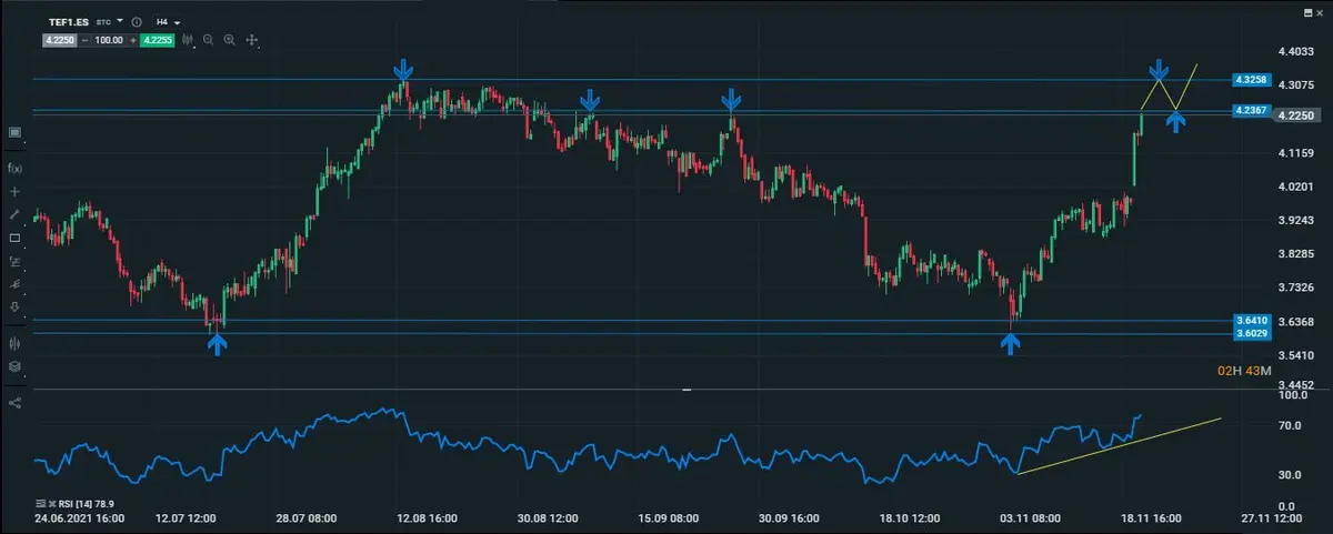 Lo comentamos al principio del artículo las telecos a nivel Europa se encuentran de fiesta, basta con ver el gráfico de telefonica para ver que su acción lleva disparada un 5.76 %, cotizando actualmente en los 4.20 puntos ¿ dónde tenemos sus techos más cercanos? Se encuentran en los 4.23 puntos, mientras que sus máximos se encuentran en los 4.32 puntos.