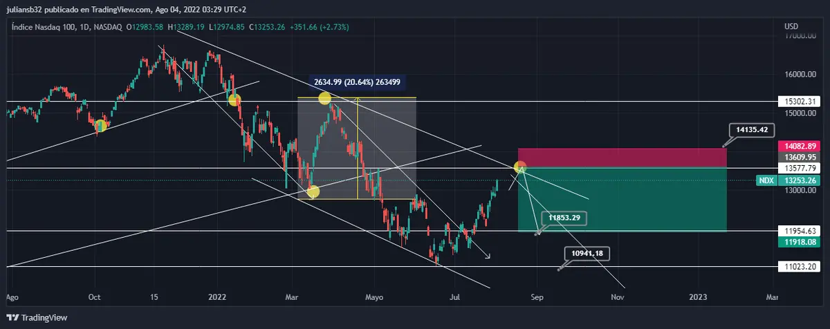 El índice de las tecnológicas Nasdaq 100 se ha recuperado desde los mínimos en la zona de los 11023 puntos, en un 20 % aproximadamente, esta recuperación se da en un contexto negativo donde la gran mayoría de participantes del mercado se dejaron llevar por la propaganda de venta y aumentaron las posiciones cortas en ese índice, además de subidas de tipos de interés por parte de la reserva federal y malos datos del PIB en los últimos días que muestra una recesión técnica.