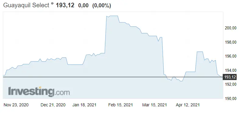 Como vemos en el gráfico de abajo, las cotizaciones del índice Guayaquil se mantienen perdiendo fuerza durante los últimos días, que son los de los inicios de mayo, con una situación actual de 193.12 puntos. Los puntos que nos resultan de mayor relevancia serán los de resistencia y de soporte del índice ecuatoriano. El nivel de resistencia lo encontraremos en 195.49 puntos, mientras que el de soporte se está manteniendo en los 192.50 puntos. ¿Qué esperamos de la bolsa ecuatoriana para el mes de mayo?