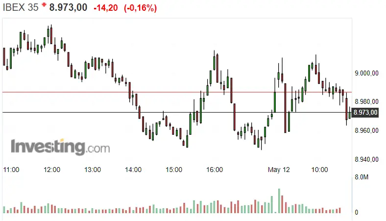 El día de hoy podemos observar nuevas bajadas en el Ibex 35, que lo dejan en un descenso de un 0.16%, es decir en 14.20 puntos, hacia niveles como el de 8973 puntos del momento actual. Por tanto, podemos decir que las cotizaciones del índice español permanecen en rojo, menteniéndose entre su nivel de soporte y el de resistencia. El primero de ellos se encuentra en unos 8947.04 puntos, mientras que el segundo se encuentra en 9033.92 puntos.