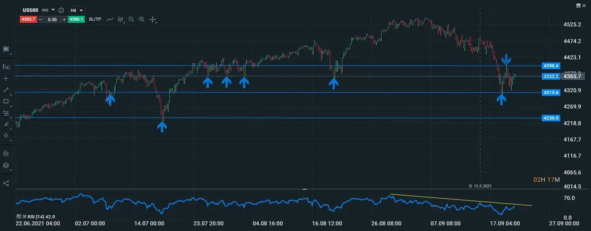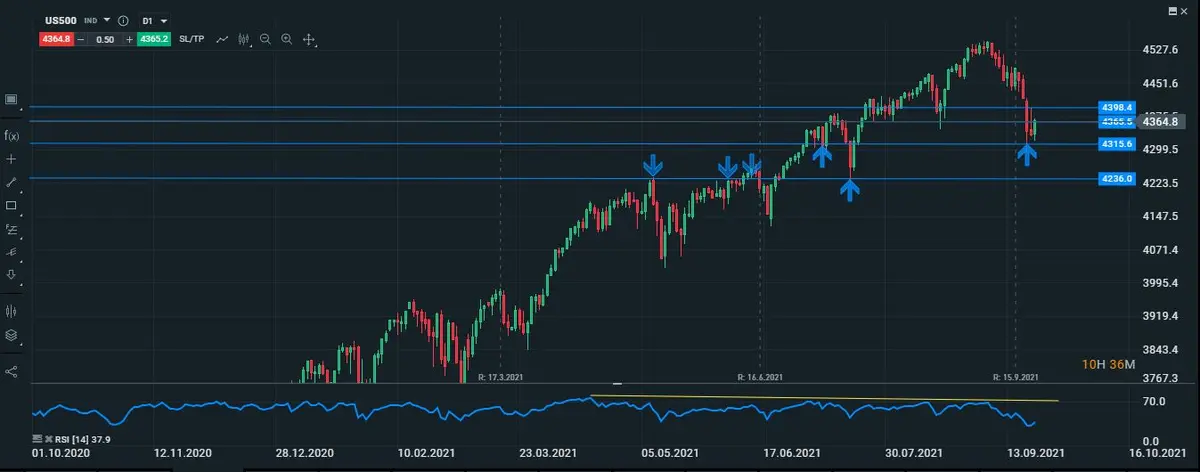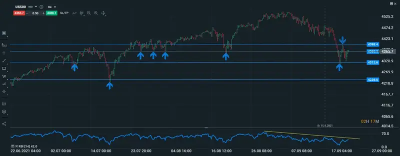 En su gráfico intradiario podemos observar que los movimientos del índice son netamente alcistas(por el momento), ya que se encuentra testeando una zona de suelos que al parecer estan funcionando muy bien de techos, y esto en un principio nos haría pensar de que los movimientos alcistas del SP están siendo relativamente cautos, ya que hoy también no hay que olvidar es el discurso de la FED, si el discurso del presidente de la Reserva Federal es complaciente, entonces se podrían dar roturas alcistas en el índices hasta los 4398 puntos, lugar en el que hemos dicho antes el precio del índice se dio vuelta a la baja y en el cual esperamos el precio se detenga a la espera de lo que pueda pasar el día viernes con las noticias de EVERGRANDE.