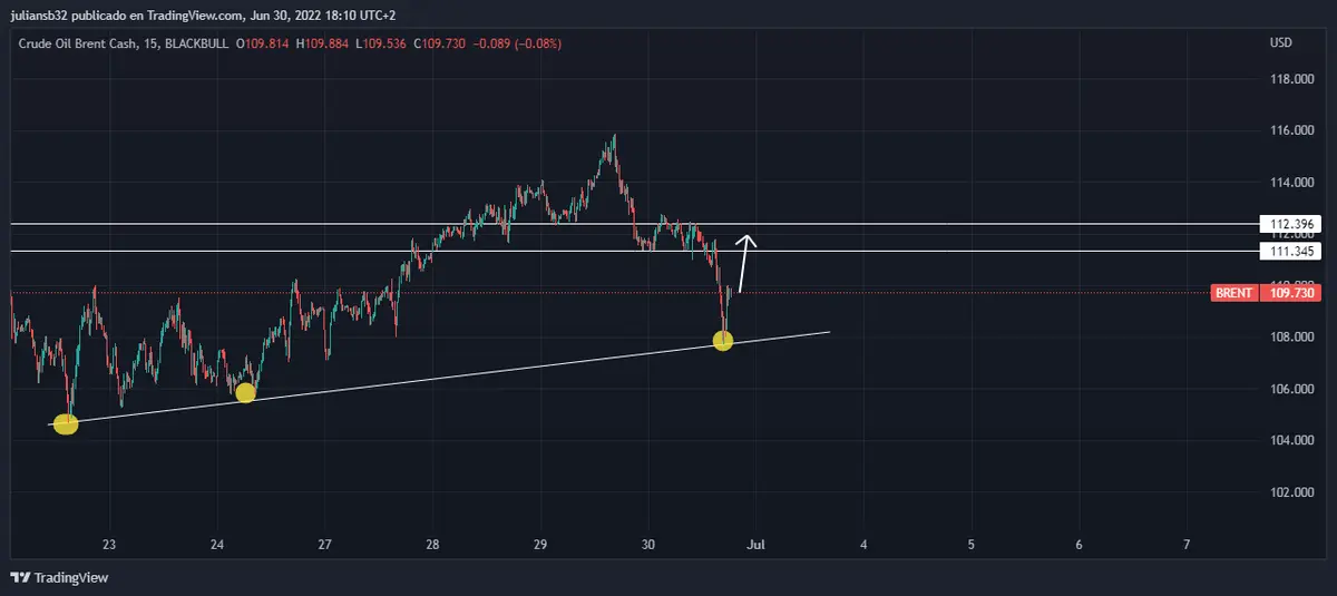 El precio de petróleo de referencia Brent alcanzo a estar en positivo en la sesión del jueves estando en la zona de los 112.736 usd para después retroceder hasta los 107.666 usd y actualmente se ubica en los 109.638 usd perdiendo 1.75%, el precio del crudo este año va estar con bastante volatilidad y con la demanda actual que hay y la OPEP siendo muy tacaños con el aumento de la producción el precio se ve favorable todavía por la manipulación de la oferta, lo que podría afectar el precio del petróleo en los próximos meses es por la parte de la disminución de la demanda , ya que los bancos centrales para contener la inflación suben tipos de interés y esto podría desencadenar en una recesión y afectaría negativamente el precio del crudo, el precio se está recuperando del ruido de las noticias de la OPEP y es probable que vuelva a los precios normales antes de las noticias donde puede actuar de resistencia.