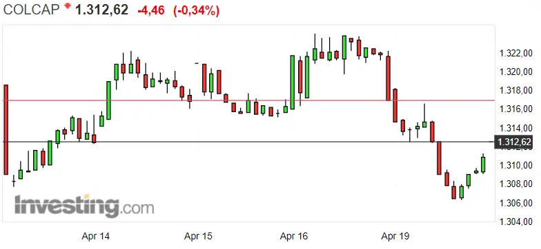 Como ya hemos dicho, el índice colombiano COLCAP va encaminado hacia abajo, dejando su trayectoria en una bajada del 0.34%, es decir; un descenso de unos 4.46 puntos. En estos momentos las cotizaciones del índice en cuestión son de unos 1312.62 puntos. No obstante, fijémonos en sus niveles de soporte y resistencia, justo en ese orden. El primero de ellos lo veremos en unos 1306.48 puntos, mientras que el nivel de resistencia ocupa unos 1324.15 puntos.