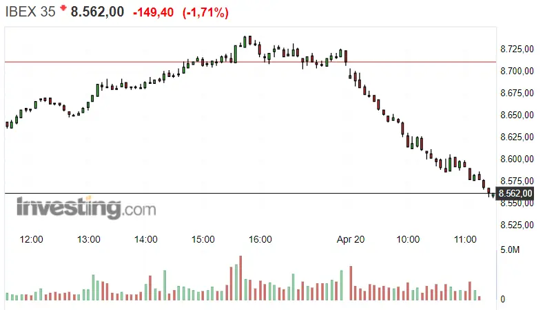 Vemos de nuevo un Ibex 35 totalmente en rojo, lo que nos indica una bajada del 1.71%; de 149.40 puntos. Actualmente las cotizaciones del índice madrileño se quedan en unos 8562 puntos. No nos olvidemos del bajón de esta mañana. El nivel de resistencia lo encontraremos en unos 8740.82 puntos, mientras que el de soporte se deja ver en 8556.09 puntos.
