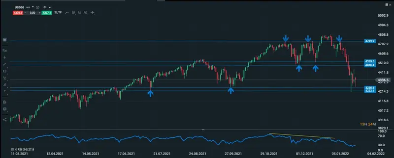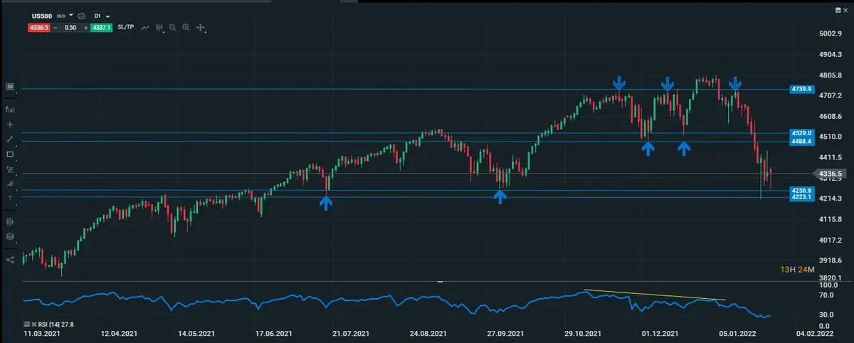 Gráfico actualizado del SP500 en una temporalidad diaria, de momento el SP ha logrado mantenerse sobre sus suelos importantes que se encuentran en los 4256 puntos.