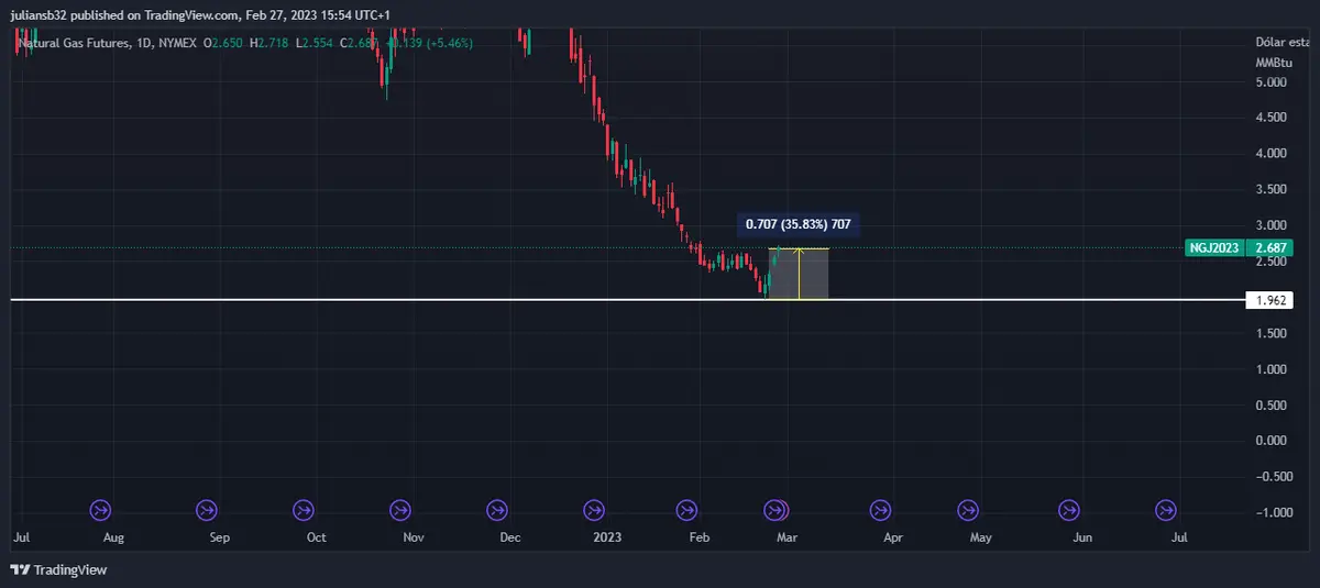 El precio del gas natural toco fondos la semana pasada, cuando el precio del gas natural llego a estar en los 1.96 USD, lo que genero una gran oportunidad de los compradores al largo plazo, y ya se ha recuperado más de un 35% desde los mínimos. El mercado del gas natural es muy volátil por el conflicto entre Rusia y Ucrania, el año pasado el precio del gas natural llego a cotizar en los 10 USD.