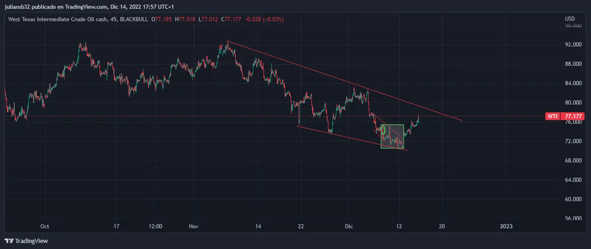 El precio del petróleo de referencia WTI ha tenido unos meses con bastante volatilidad, y ahora parece resurgir con la reapertura de China. La demanda de crudo puede mejorar, si se reactiva el consumo mundial, lo que parece difícil con políticas monetarias restrictivas. El precio tocó fondo el 9 de diciembre, al llegar a la zona de los 70 USD, y ahora se recupera cerca a la zona de los 80 USD. En la sesión actual, el precio del petróleo de referencia WTI, se ubica en la zona de los 77,00 USD, lo que representa una subida de +1,61 USD y una variación positiva de +2,14%. El precio está en una fase de recuperación, pero no muestra todavía signos técnicos para los compradores, y se podría generar correcciones de la fase de recuperación.