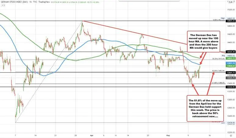 Mirando el gráfico horario del Dax alemán, el mínimo de esta semana se estancó cerca del 61,8% del movimiento al alza desde el mínimo del 7 de abril. Ese nivel viene en 13388.