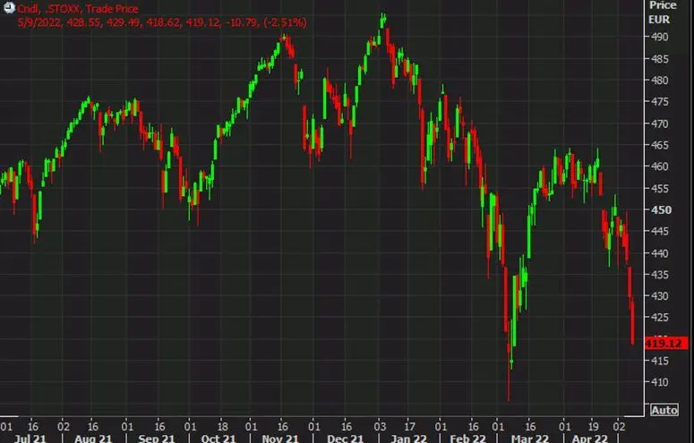 Este es el Stoxx 600 y los otros gráficos son similares. No hay mucho en el camino del soporte hasta el mínimo de marzo.