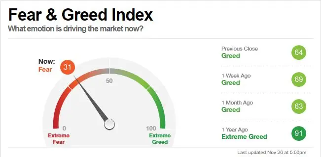 El día viernes el índice de miedo y codicia de la CNN, cambió radicalmente de posición tras el anuncio de la nueva variante del virus llamada Omicron, y que ya se encuentra esparcida por países como Botsuana, Hong Kong, Bélgica y Sudáfrica. Las caídas que se registraron en los principales índices bursátiles comenzando por Asia, dónde el Hang Seng de Hong Kong perdió más de un 3%, mientras que el Shanghai Comp. perdía algo más del 2%, en Europa las caídas fueron más duras el Dax perdió más de un 4%, el Eurostoxx50 perdía algo del 5%, y el Ibex35 un 5,28%. En EE.UU, las caídas no fueron tan severas ya que gran parte de los mercados se encontraban cerrados, pero aún así no evitó la caída del Russel2000(índice de pequeñas compañías) que borró de un plumazo todo lo que había conseguido durante todo el mes con una caída del 5.72% .
