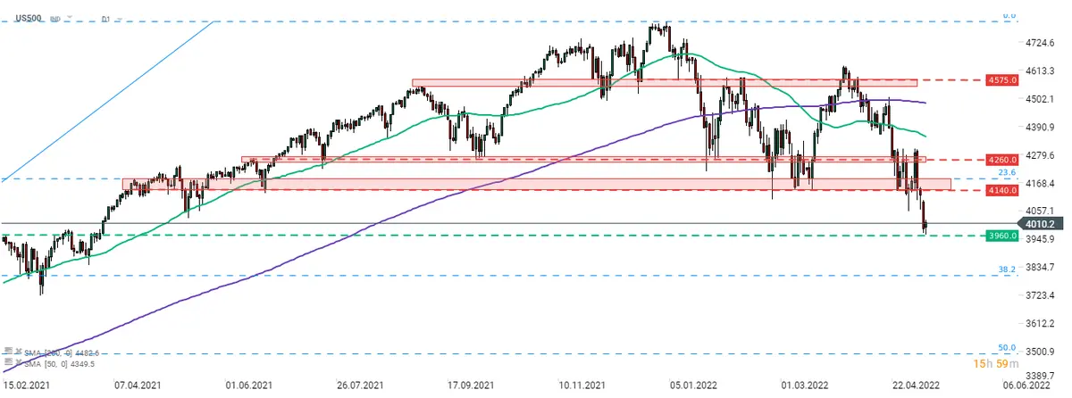 El S&P 500 (US500) cayó ayer por debajo de los 4,000 pts y probó un soporte de 3,960 pts. Las caídas se detuvieron allí y los futuros sobre índices comenzaron a recuperar terreno durante la negociación asiática. US500 logró volver a subir por encima de la Marzec de 4,000 pts pero el rebote carece de impulso y puede ser frágil. Fuente: xStation5