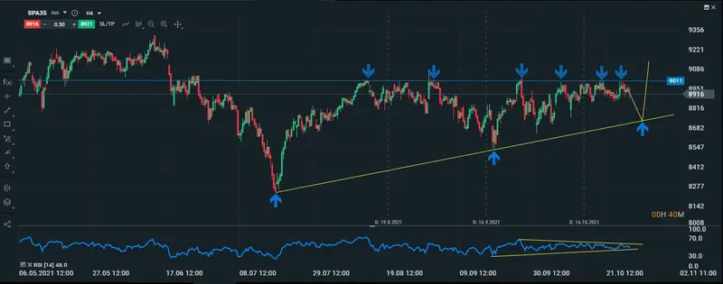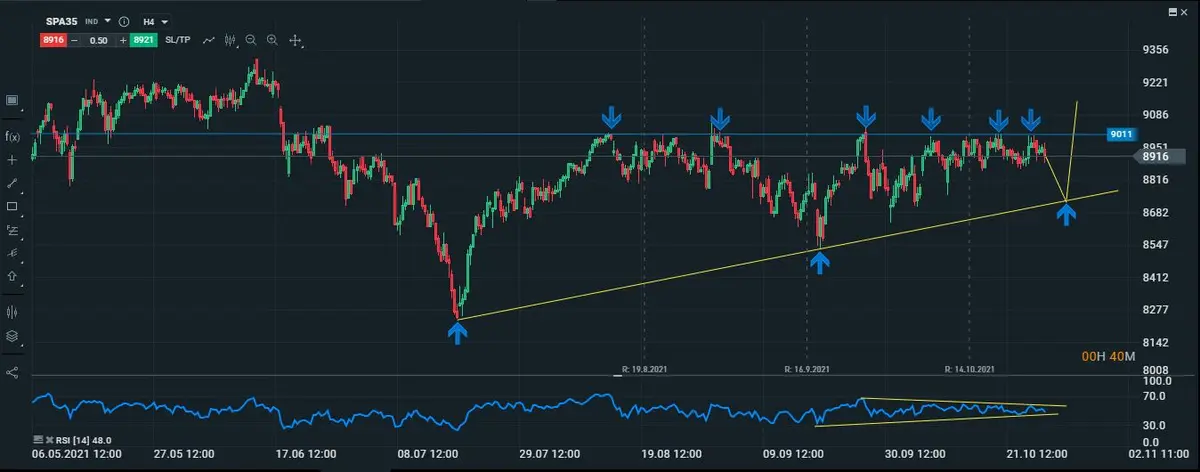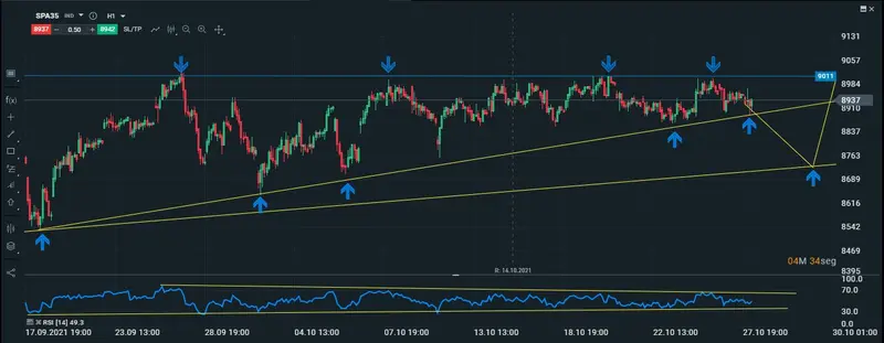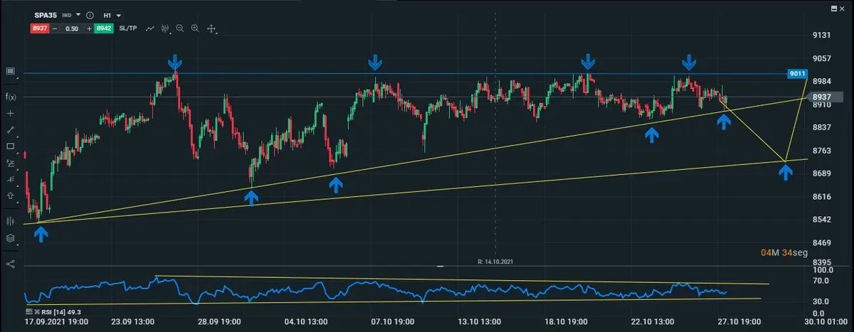 No hay sorpresa más agradable cuándo el mercado te suele dar la razón, y en el caso del IBEX35, mucho más, tras nuestra visión para la presente semana que impartimos el pasado día lunes, a día de hoy jueves lo que vemos es que el índice español sigue de capa caída y tal parece que ha encontrado su criptonita en los techos que se encuentran sobre los 9011 puntos, aunque sus mínimos son crecientes y como se puede apreciar en su gráfico de 4h, los últimos movimientos del índice español han sido los de mantenerse en un movimiento netamente lateral, que oscilan entre los 9011 puntos y los 8848 puntos, lugar en el que creemos que de llegarlos a perder el precio del Ibex se iría directo a testear la línea de mínimos crecientes que antes hemos mencionado, en el caso de que los movimientos del precio del Ibex sean los de romper dicha línea, entonces nos podríamos estar encontrando ante una seria corrección, que de cumplirse el Ibex tendría caída libre hasta los siguientes suelos que se encuentran sobre los 8500 puntos, sería una pérdida de alrededor de un 4% en el valor del índice.