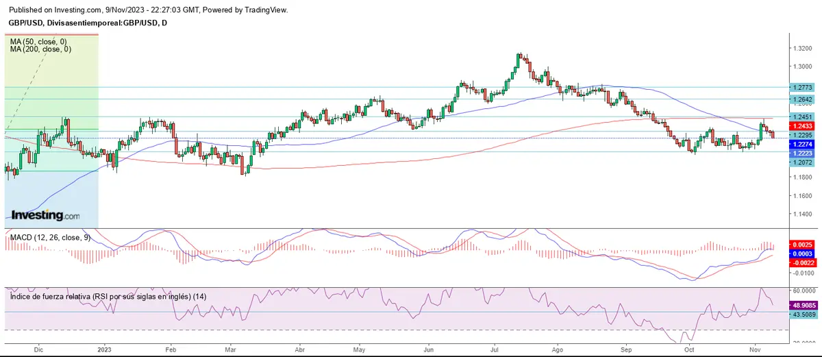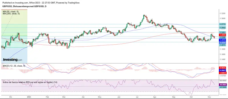 La corrección del GBP/USD es más notoria a pesar de haber superado también la resistencia y retrocede hasta 1.2224.