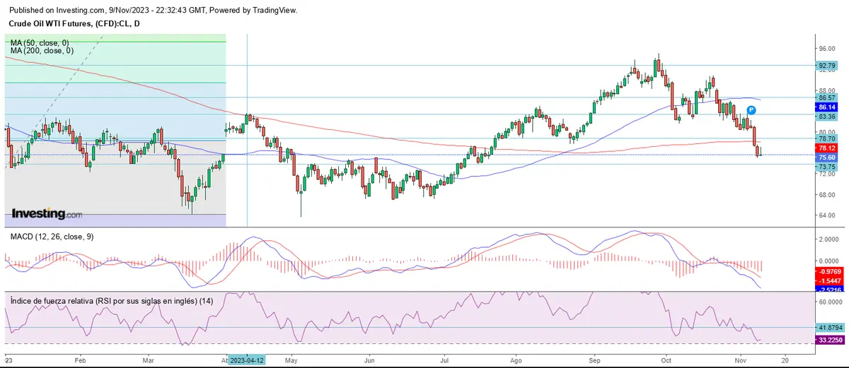 El crudo WTI no consigue quitarse a los osos de encima y sigue cayendo hasta los 75.60 dólares, habiendo roto el soporte en los 78.70 dólares.
