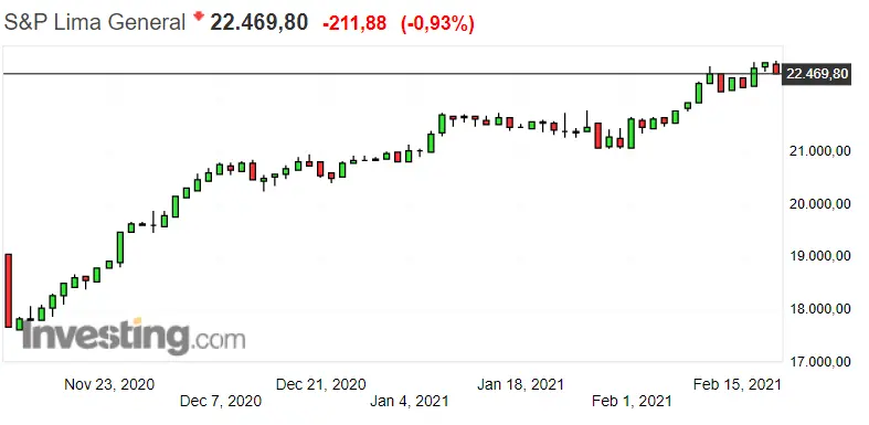 Como ya hemos leído en el título y podemos comprobar en el gráfico de abajo, el índice peruano se encuentra en un descenso dejando las cotizaciones del momento actual en 22469.80 puntos. Si buscamos el nivel de soporte del índice S&P Lima General, lo veremos en 21010.11 puntos, mientras que el nivel de resistencia lo podemos encontrar en 22729.90 puntos. Actualmente la bolsa peruna se encuentra en rojo, con descensos del 0.93%, lo cual se traduce en bajadas de 211.88 puntos.