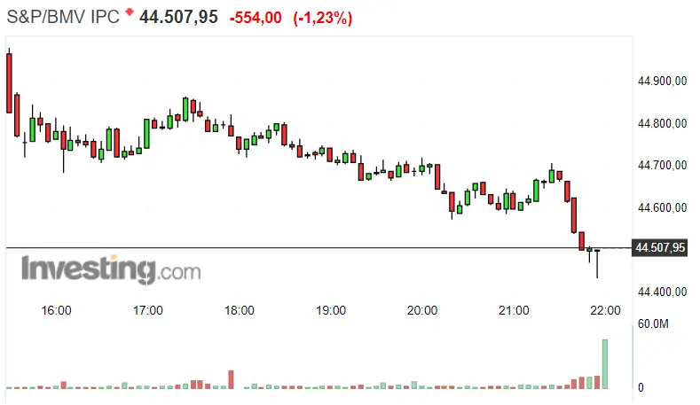 Vemos niveles de soporte y resistecia propios del índice mexicano S&P BMV IPC bastante dispersos aunque las cotizaciones del momento actual se encuentren más próximas al nivel de soporte que al de resistencia. El nivel de resistencia lo vemos en 44866.18 puntos, mientras que el de soporte lo encontramos en 44436.16 puntos. Si nos fijamos en lo que está sucediendo en el momento actual, veremos una bajada de 1.23% que desciende unos 554.00 puntos, dejando las cotizaciones del índice en unos 44507.95 puntos. ¿Qué es lo que más le afecta al comportamiento de la bolsa mexicana en estos momentos?
