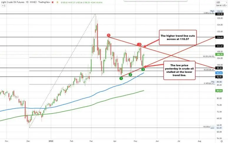 Los futuros del petróleo crudo se liquidan el día a $106,13. Eso es un aumento de $ 0.42 o 0.4%.