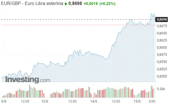 EUR/GBP: Apertura (06/15) = 0,8678 GBP; Último cierre (06/15) = 0,8679 GBP