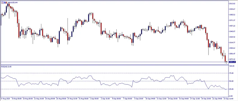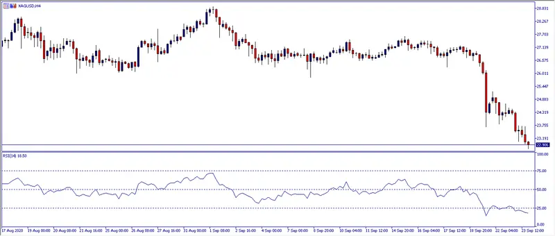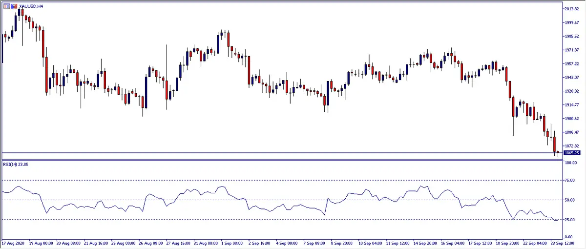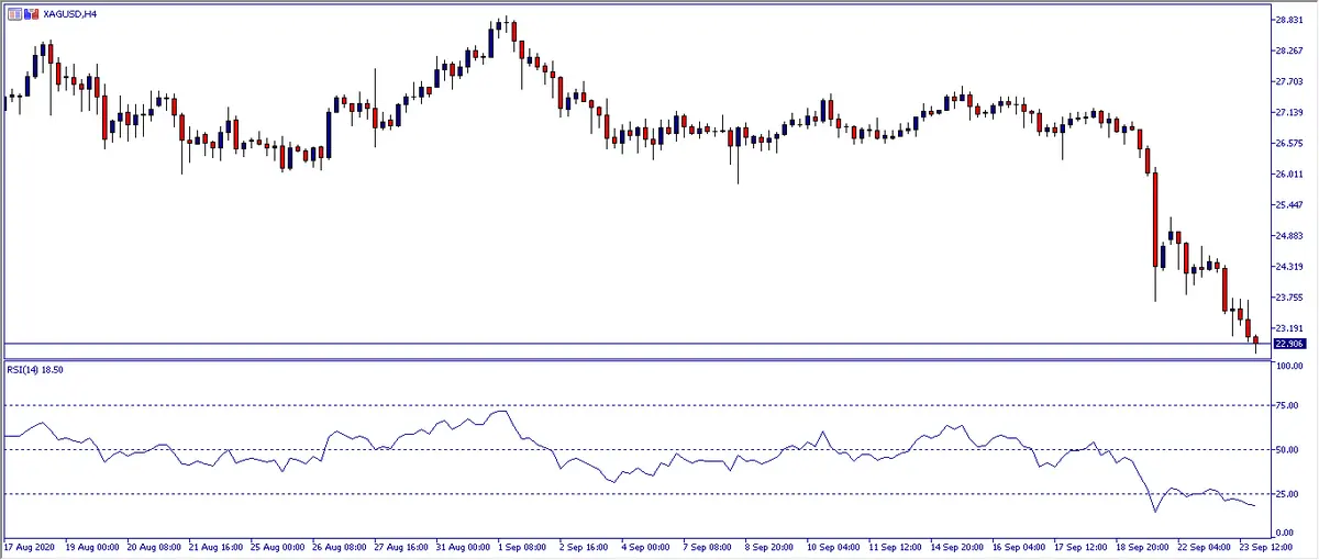 Los metales preciosos en caída libre frenan en soportes clave de vital importancia. Ahora bien, el Oro ha abandonado la dirección lateral y alcanza un soporte clave, mientras sitúa su nivel de cambio en 1.865,25 Dólares por Onza además, la Plata experimenta un brutal desplome de un 15% desde la apertura semanal, mientras sitúa su cotización en 22,90 Dólares Estadounidenses. Veamos qué información podemos obtener del Índice de Fuerza Relativa “RSI”.