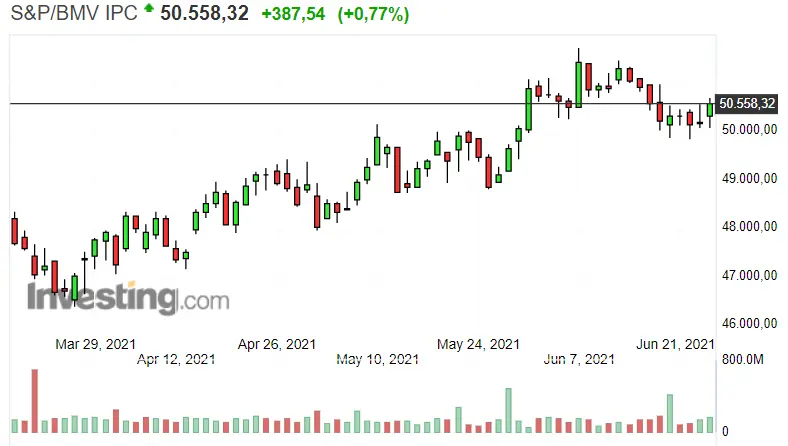 Vemos niveles de soporte y resistecia propios del índice mexicano S&P/BMV IPC dispersos aunque las cotizaciones del momento actual se encuentren más próximas al nivel de resistencia que al de soporte. El nivel de resistencia lo vemos en 50679.99 puntos, mientras que el de soporte lo encontramos en 50042.78 puntos. Si nos fijamos en lo que está sucediendo en el momento actual, veremos una subida de 0.77% que asciende unos 387.54 puntos, dejando la bolsa mexicana en verde. ¿Inviertes en el S&P BMV IPC? Sus cotizaciones del momento actual están por los 50558.32 puntos. Cabe mencionar que el índice mexicano se ve influenciado hoy por los datos de la actividad económica, que serán publicados a las 14:00 de la tarde de hoy.